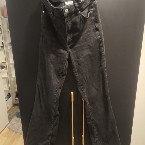 Kuvan farkut, koko lapuista. Käytetyt on ja pepussa vähän nukkaantumista. Etureidessä pieni reikä ja takataskussa pieni reikä, lahkeet ehjät.