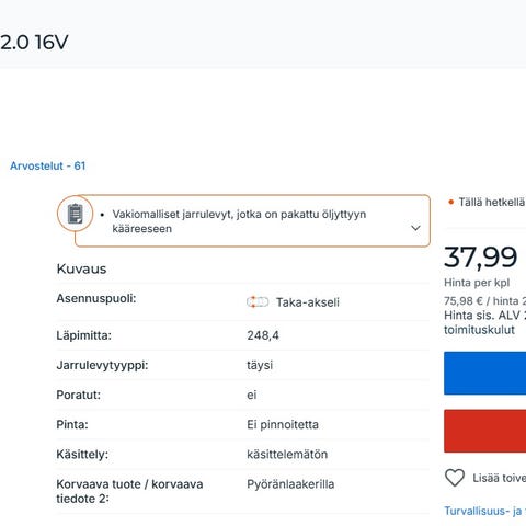 Uudet (Peugeot 307?) takajarrulevyt 2kpl (ovh.27,90 kpl) Ei käyneetkään omaan autoon. Lisätietoja ja kuvia kysymällä. Nouto tai kulkeutuu omien menojen mukaan Lahteen.
