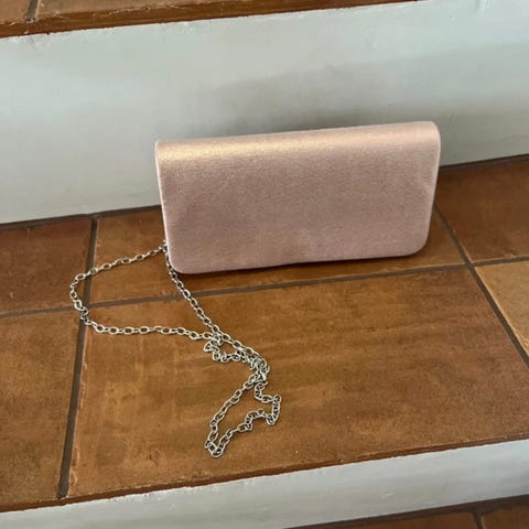 käsilaukku, koko n.16*10*5 cm, ruusukulta-ruskea (?), uusi, mutta säilytyksessä tullut nurjalle puolelle muutama nirhautuma, ei näy päälle ja ei vaikuta käyttöön
