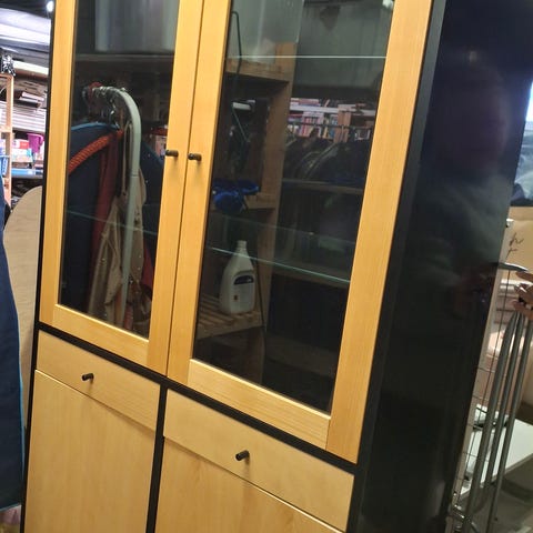 Kaksi alakaappia, ja 4 yläkaappia. Yläkaapit kiinnitetään seinälle. Lasiovet.