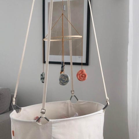 Hyvässä kunnossa. Kehdon voi ripustaa komijalkaan tai kattoon (kattokoukku kadoksissa, mutta uusia saa ostettua)