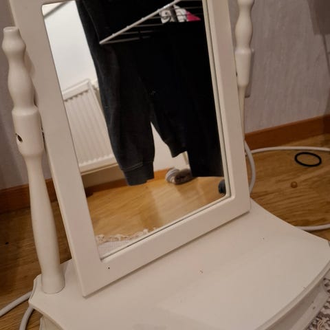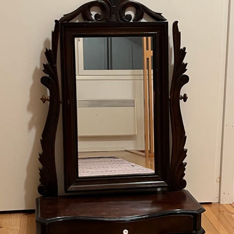Myydään kaunis ja hyväkuntoinen puinen piianpeili. Yhdellä laatikolla ja peilin kulmaa voi säätää.