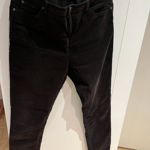 Ruskeat vakosamettia. Koko 38. Hyvä kunto. Vetoketju ja taskut ovat ehjät. Toisessa lahkeessa pieni värihaalistuma. Lahkeen sivun pituus vyötärön yläreunasta helmaan on 103 cm. Lahkeen sisäsauma pituus helmaan on 79 cm.