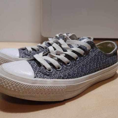 Pari kertaa kävellyt leveämpilestiset converset mustilla nauhoilla.