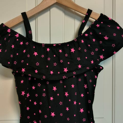 Lasten musta mekko, jonka yläosassa glitteriä. Merkki on Pinky ja koko 158. Lisäkuvia saa pyytää :]