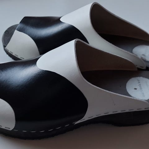 Marimekon musta-valkoiset jokeri kuvioiset puukengät. Päälliosa nahkaa, pohja puuta ja kumia. Olleet vähäisellä käytöllä sisäkenkinä. Nahkassa näkyy värin kulumaa sivuilla, muuten hyväkuntoiset. Koko 40.