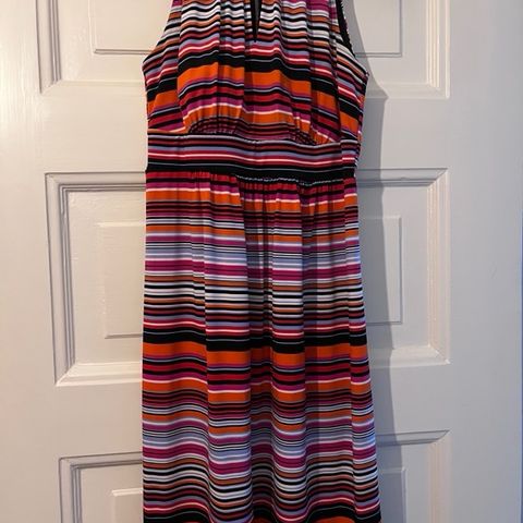 Kaunis musta mekko halterneck-yläosalla. Helmassa valkoinen kukkakuvio, sivussa vetskari. Takaosa joustaa selän kohdalta kuminauharypytyksen ansiosta, muuten joustamatonta puuvillakangasta. Laskokset vyötäröllä edessä ja takana. Koko 36. Ulottuu noin polveen asti. Sopii juhlaan ja arkeen. Ehjä ja hyväkuntoinen mekko. Nouto Kirkkonummelta tai postitus toridiilinä.