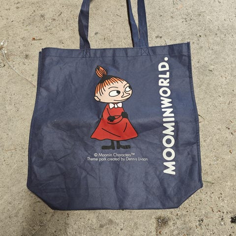 Suloinen, paksuhkoa puuvillakangasta oleva musta Muumi kassi, korkeus 33cm, lev 21cm ja syv 11cm. Tämä on ollut kerran käytössä eli ei juuri käytön jälkiä näy. Niiskuneidin jalassa haalea viiru, joka näkyy kuvassa.