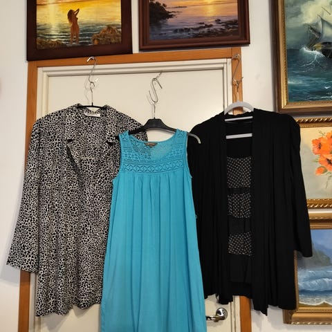 Pitkä trikoo mekko koko 38 -40, tyydyttävä kunto 4e. Toinen mekko erinomainen kunto koko 42. Yläpuolella on venyvä kangas, hame puuvilla kangas 15e .