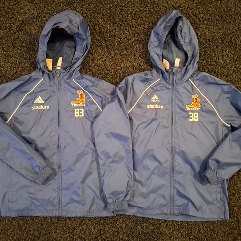 Tikkurilan Tiikerit (Adidas) välikausitakki numerolla 8, koko 152. Tarkasta vedenpitävyysasteesta ei tietoa, mutta ainakin vettä hylkivä. Kunto erinomainen.