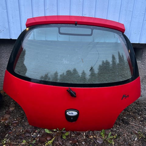 Hyväkuntoinen takaluukku. Pyyhkijän reiän ympärillä helposti korjattavissa oleva ruoste. Lukkopesä myydään erikseen