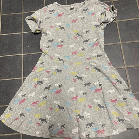Kiva vaalea ahkerasti käytetty mekko eri värisillä hevosten kuvilla koossa 98/104 cm. Sivuilla rypytys. Muutama haalea tahra kuvissa. Materiaali trikookangasta.