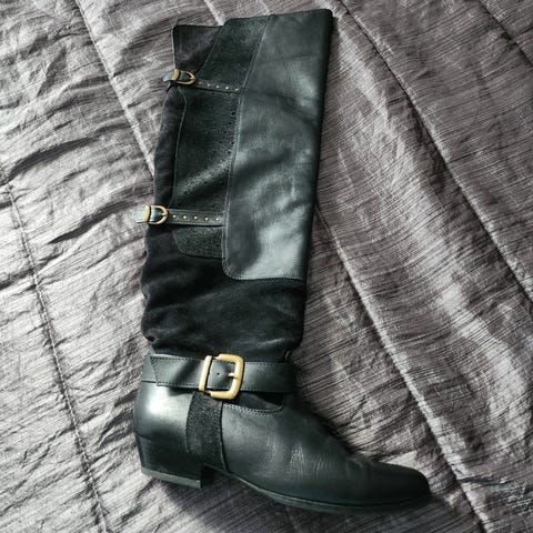 Mustat JANITAN Nahka saappaat. Harmaa karva Vuori. Kotimaiset. Vähällä käytöllä. Koko 5 1/2.Pituus varresta 32.
