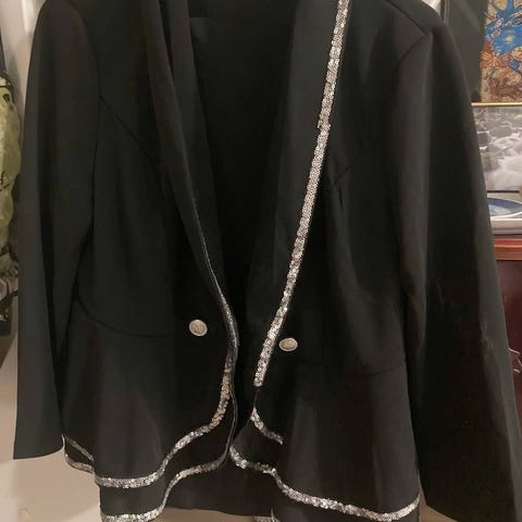 Rosemunden kaunis paljettijakku. Harmillisesti nahkaa jäljittelevistä osista kuoriutuu pintaa, jonka ehken saisi siistiksi kun hieman huoltaisi. Muuten jakku on moitteeton ja upea.
