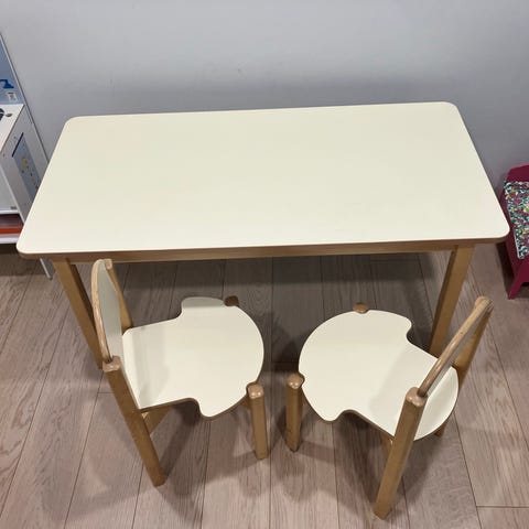 Myydään kuvan mukainen tukeva täyspuinen lasten pöytäryhmä, sisältää pöydän ja kaksi tuolia. Ei huoju eikä nitise. Joitain käytön jälkiä pinnassa, pintakäsittelystä on aikaa. Tästä hyvä ja kestävä ryhmä seuraaville käyttäjille.