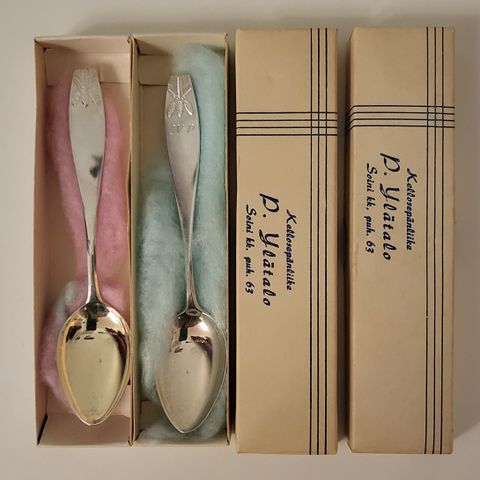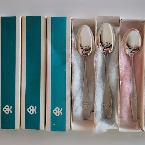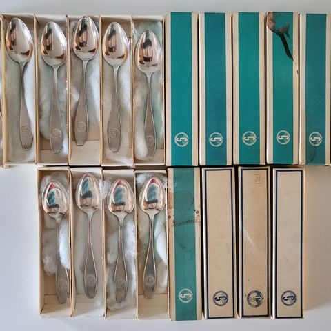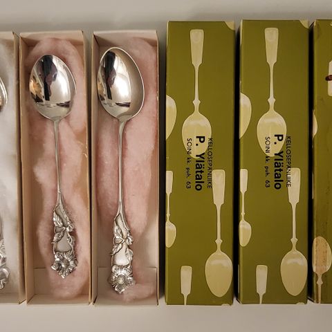 Lusikat ovat naarmuttomia ja käyttämättömiä, ovat olleet vitriinissä alkuperäisissä laatikoissaan yli 50 vuotta.