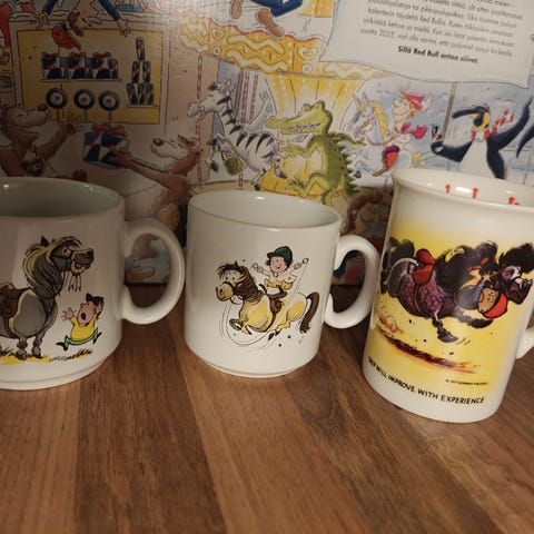 3 kpl sinisiä heppamukeja ja 1 kpl vihreä heppamuki, kotimaisia, käsintehtyjä. Hinta yhteensä neljältä.