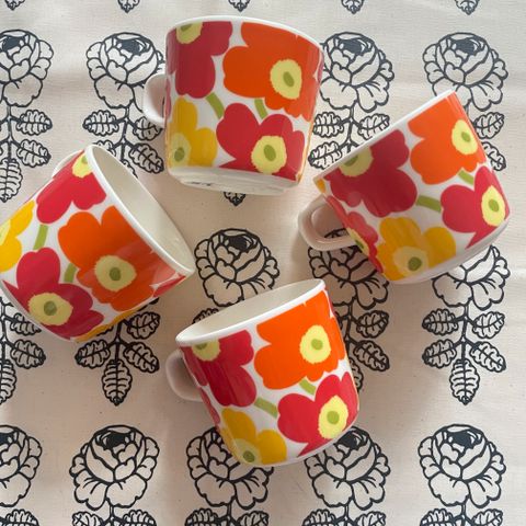 Kaksi Marimekon kahvikuppia, ehjät, mustissa unikko kukissa pieniä viukaleita joissain kohtaan havaittavissa.