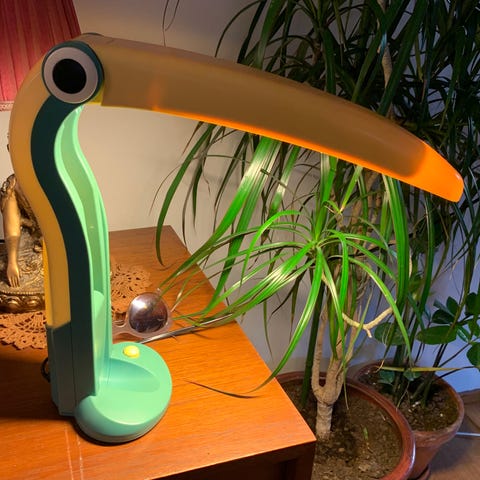 Virheettömässä kunnossa oleva kelta/ vihreä tukaani-valaisin. Väreissä ei haalentumaa. Toimiva pienoisloisteputki ( 11w) mukana. Toimii nokka auki pöytävalaisimena ja nokka kiinni yövalona. Johdon pituus n.180cm. Savuton ja eläinvapaa talous. Nouto Länsi-Vantaa, postitus (+10€) kun maksu suoritettu, tilisiirto tai mobilepay.