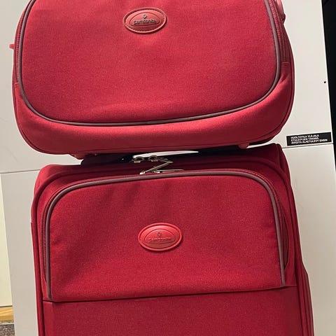 Tumman sininen Samsoniten käyttämätön lentolaukku.