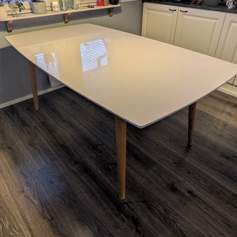 Pöytä pelkästään. Pöydässä muutama kevyt naarmu.