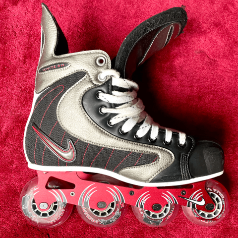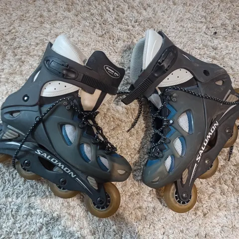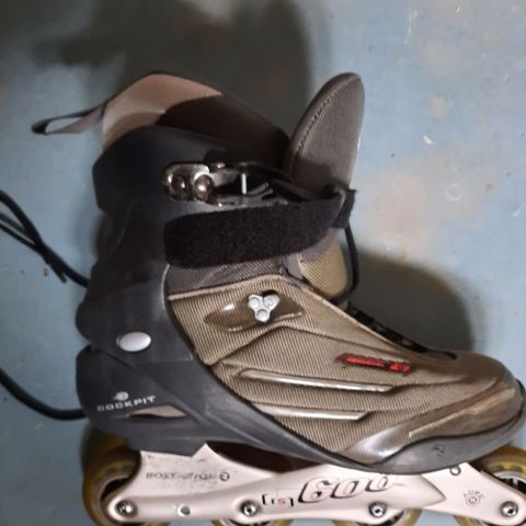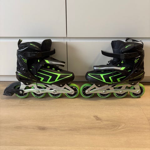 Koko settiä vain muutaman kerran käytetty, joten kunto erinomainen. 90mm pyörät ja oikean jalan luistimessa jarrupala, joka ei ole kulunut juuri lainkaan. Helppo ja nopea kiinnitys.