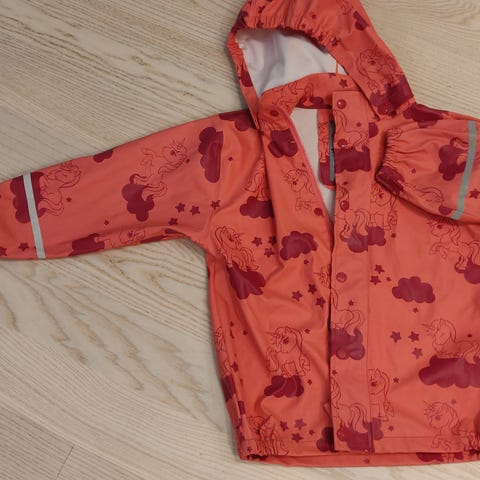 Siisti punainen valkopilkullinen sadetakki koossa 128 cm