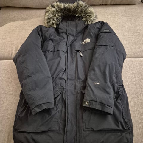 Isoa S-kokoa oleva miesten musta The North Face parka. Itse 174cm ja 88kg ja sopii erinomaisesti.
