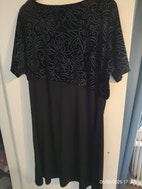 Musta, jossa halkio edessä. Kangas nätisti laskeutuva ja venyy jonkun verran. Merkki Mia Moda. Kokolappu leikattu pois, mutta noin XXL kokoisella ollut. Pituus puoleen sääreen, yläosa kultaisia kuvioita, lyhyet hihat. Leveys n 58 cm, venyy noin 10 cm tästä. Kainalosta kainaloon mitta n 70 cm. Kangas yläosasta samettimaista, alaosa joustavaa polyesteri/elastaania. Myynti toisen puolesta. Pidetty kerran eli uuden veroinen