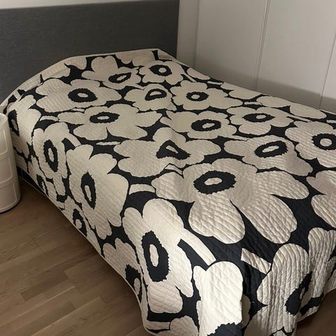 Sopii parisängyn päälle, koko 260x260cm. Kuvissa peite on korkeahkon 180x200cm sängyn päällä.
