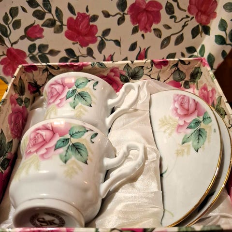 Kaunis ruusukuvioinen tee-setti. Kuppi, alunen tee sihdille ja teesihti. Uusi. Löytyy kaksi samanlaista settiä, 8 € kpl.Voin postittaa, kulut ostajalle . Toridiilikin käy.