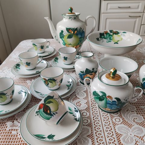 Astiaston sisältää: 6 kahvikuppia, 5 asettia, 6 pullalautasta, kahvikannu, sokerikko, kermakko ja korppukulho. Yksi lautanen puuttuu