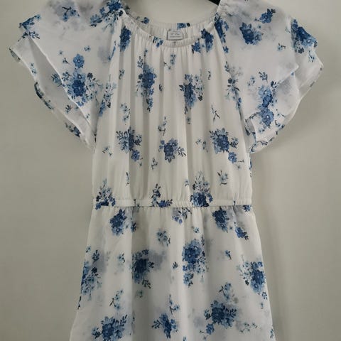 Pari kertaa pidetty mekko, kauluksessa sauman purkama (1cm) ei ole meitä haitannut,näppärä korjaa parilla neulan pistolla. Valkoinen/tummansininen