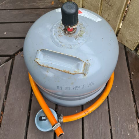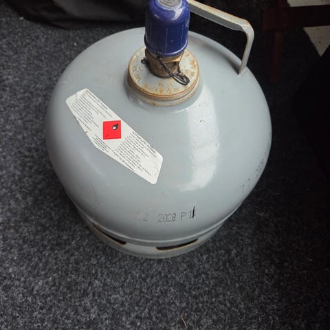 5 kg:n painoventtiilillä varustettu teräskaasupullo eli kuori. Vähän kaasua ehkä jäljellä pohjalla.