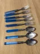 Käytetyt haarukat ja ruokailulusikat. Käytön jälkiä näkyy.