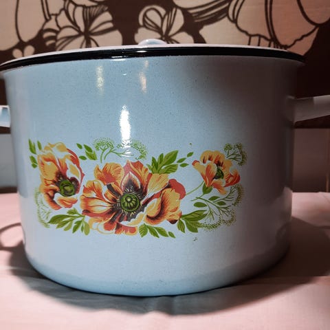 Halkaisija 31 cm ja korkeus 15 cm. Käytön jälkiä. Sopii kukkaruukuksi tms.