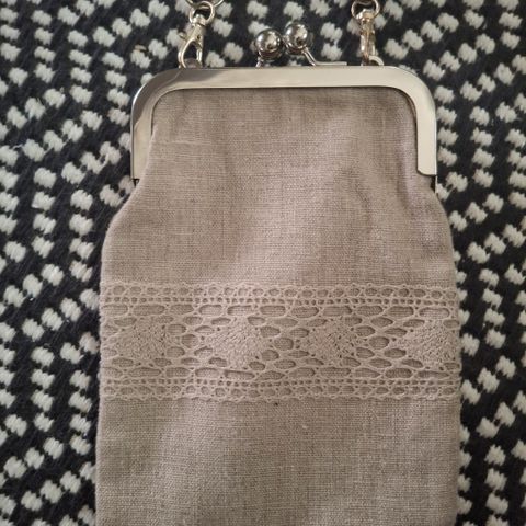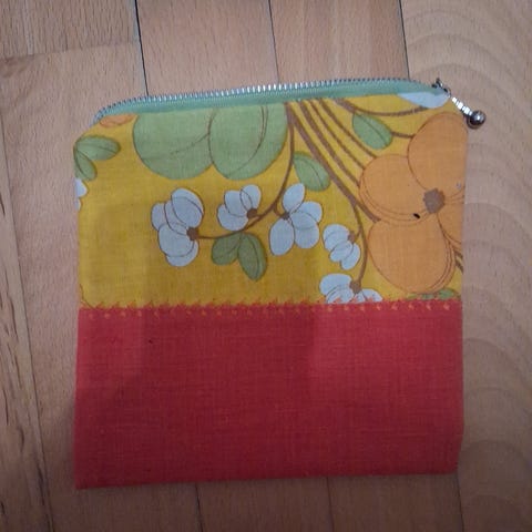 Myydään pieni kukallinen kangaspussukka ja kankainen merkki.