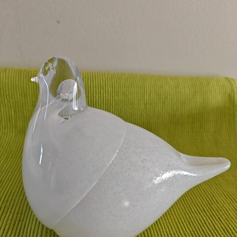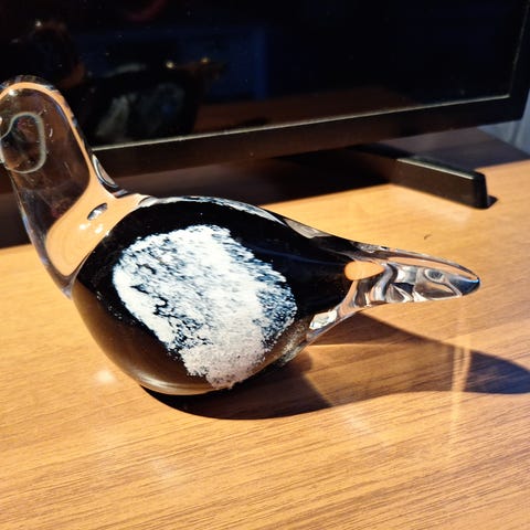 Kotimaista käsityötä sininen suokukko lasilintu "pronssisella" päällä ja heltalla, korkeus n. 18 cm, leveys n. 9,5 cm ja pituus n. 21 cm.