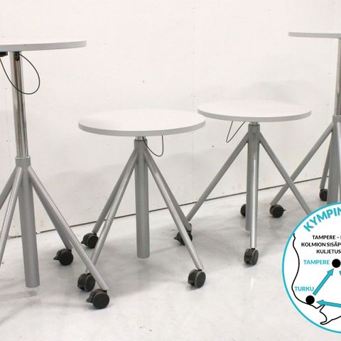 Halkaisija 60cm, korkeuden säätöväli 71cm - 112cm. Hinta 220€ + alv 25,5% = 276,10€ . Varastossa 6kpl. Pöydät ovat Tampereen toimipisteessa, mutta liikkuvat tarvittaessa muihin toimipisteisiin.