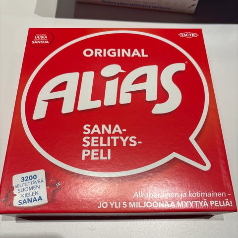 Alias-sanaselityspelin Suomi-versio. Peliä on pelattu vain muutaman kerran aikuisporukalla ja kunnoltaan se on uutta vastaava. Kaikki kortit, nappulat ja muut osat ovat tallessa.