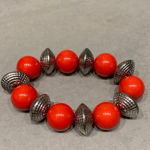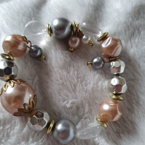 Hematiitin näköistä ja tuntuista materiaalia oleva rannekoru. Aika painava, joten ei ole muovia. Joustava kuminauhamekanismi.