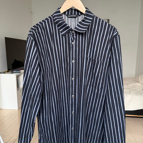 Miesten Marimekko Jokapoika-paita koko 48 (kauluksen ympärysmitta). Etukappaleen leveys kainalosta kainaloon 70cm, paidan pituus 80cm olkapäästä helmaan. Väri oliivinvihreä-siniharmaa. Kestävää 100% puuvillaa (vanha paksumpi laatu). Ehjä ja tahraton. Käytön jälkiä vain haalistuma kauluksen käänteen kohdalla.
