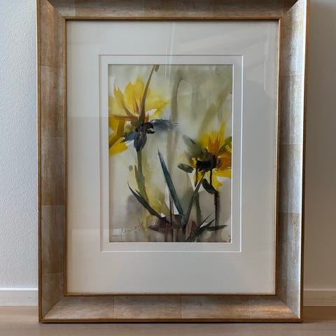 Sinisävyinen abstrakti akvarelli (1992). Koko n. 90 x 120cm kehyksien kanssa. Kunnoksi laitettu ”kohtalainen”, koska teos irronnut paspiksesta ja kiinnitetty itse uudelleen.