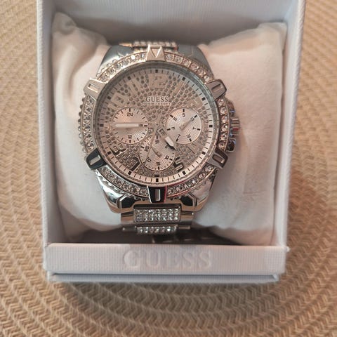 Hieno GUESSin monitoimi rannekello. Kellotaulu n. 45 mm halkasija ja säätönupin kanssa 50 mm leveyttä. Sininen muoviranneke.