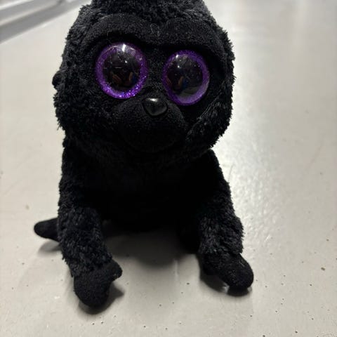Ty merkin kiiltäväsilmäinen pehmolelu, toimii myös puhelintelineenä kivasti