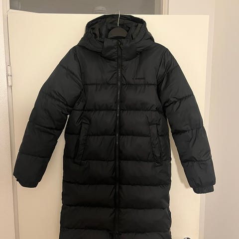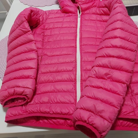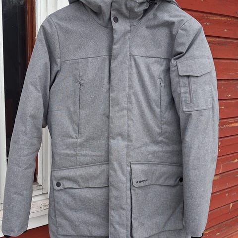 Tummansininen ohuempi toppatakki / välikausitakki. Hyvät ominaisuudet, irroitettava huppu ym. Hajusteeton pesu, ei kotieläimiä.