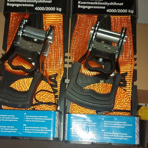 Sidontavyösarja neljälle pyörälle. Näillä neljällä liinalla sujuu auton kiinnitys nopeasti ja helposti.