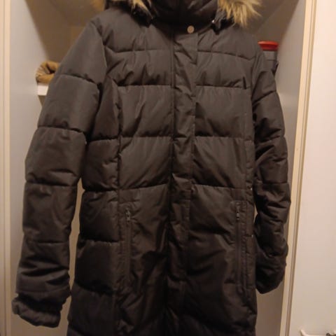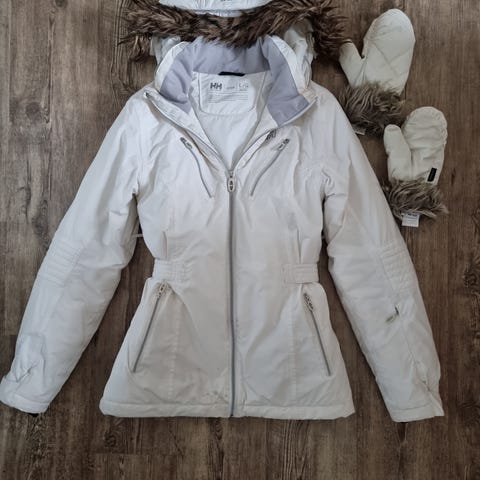 Satunnaisesti muiden takkien ohella käytetty siisti hyväkuntoinen pitkä valkoinen HH talvitakki. Irrotettava huppu, hupussa irrotettava karvareunus. Niskasta helmaan 90cm, kainalosta helmaan 60cm, kainalosta kainaloon 55cm.