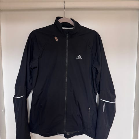 Adidaksen mustavalkoinen juoksutakki. Ohutta tuulen ja tihkun pitävää materiaalia.
