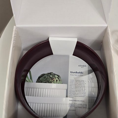 Ruskea Arabia uunikokki vuoka. Suunnittelija Tapio Yliviikari 1979. Isompi koko. Kork.7.5 cm, halkaisija 23 cm. Hiukan käytön jälkeä.